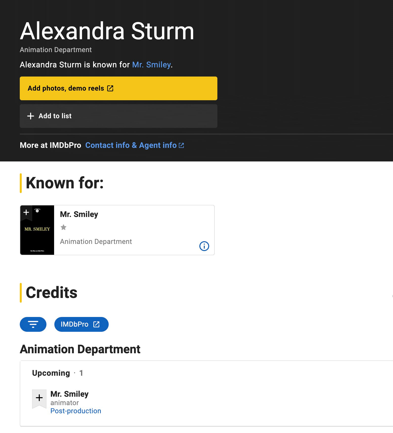 I worked as head animator on feature film Mr. Smiley. I was also responsible for German/English subtitles.